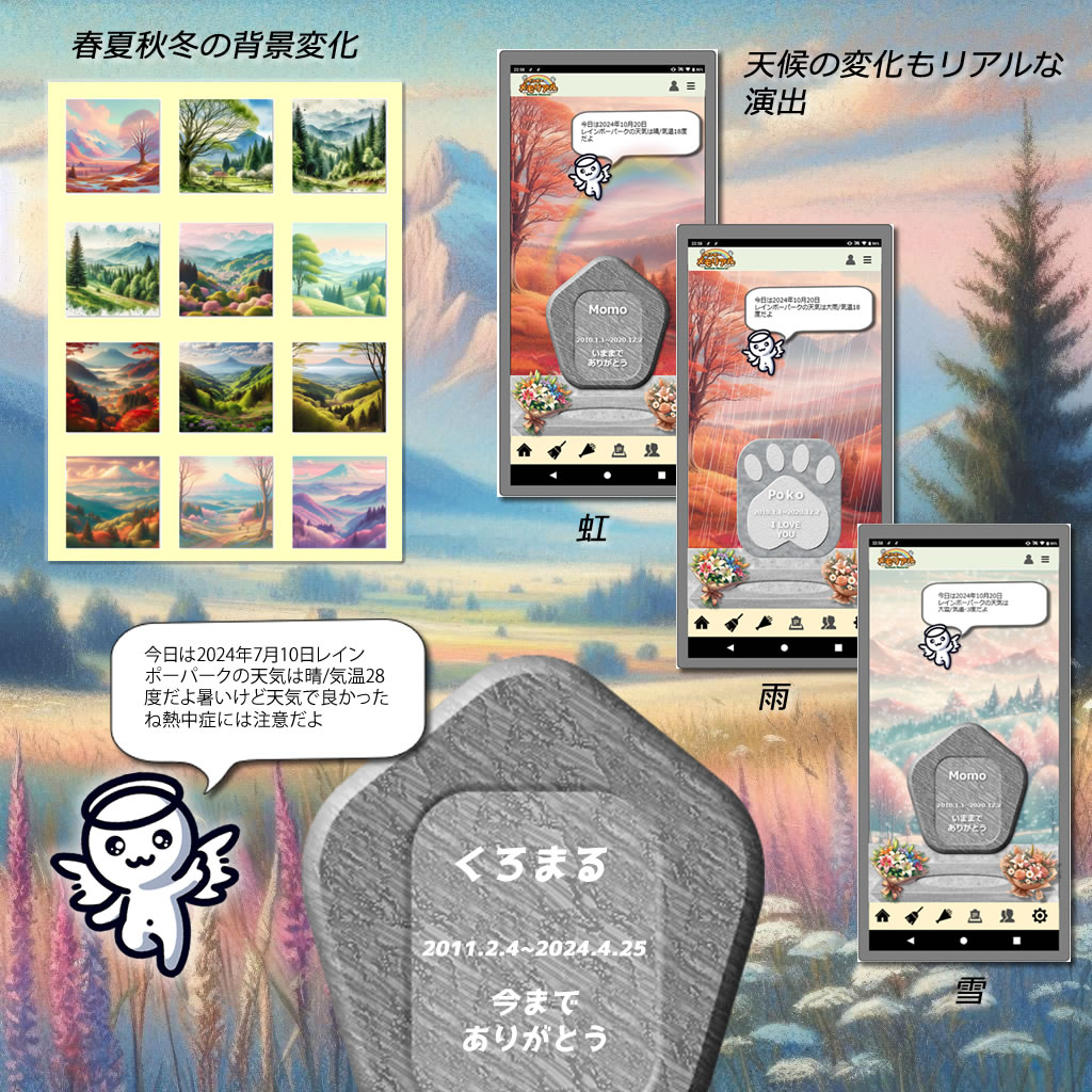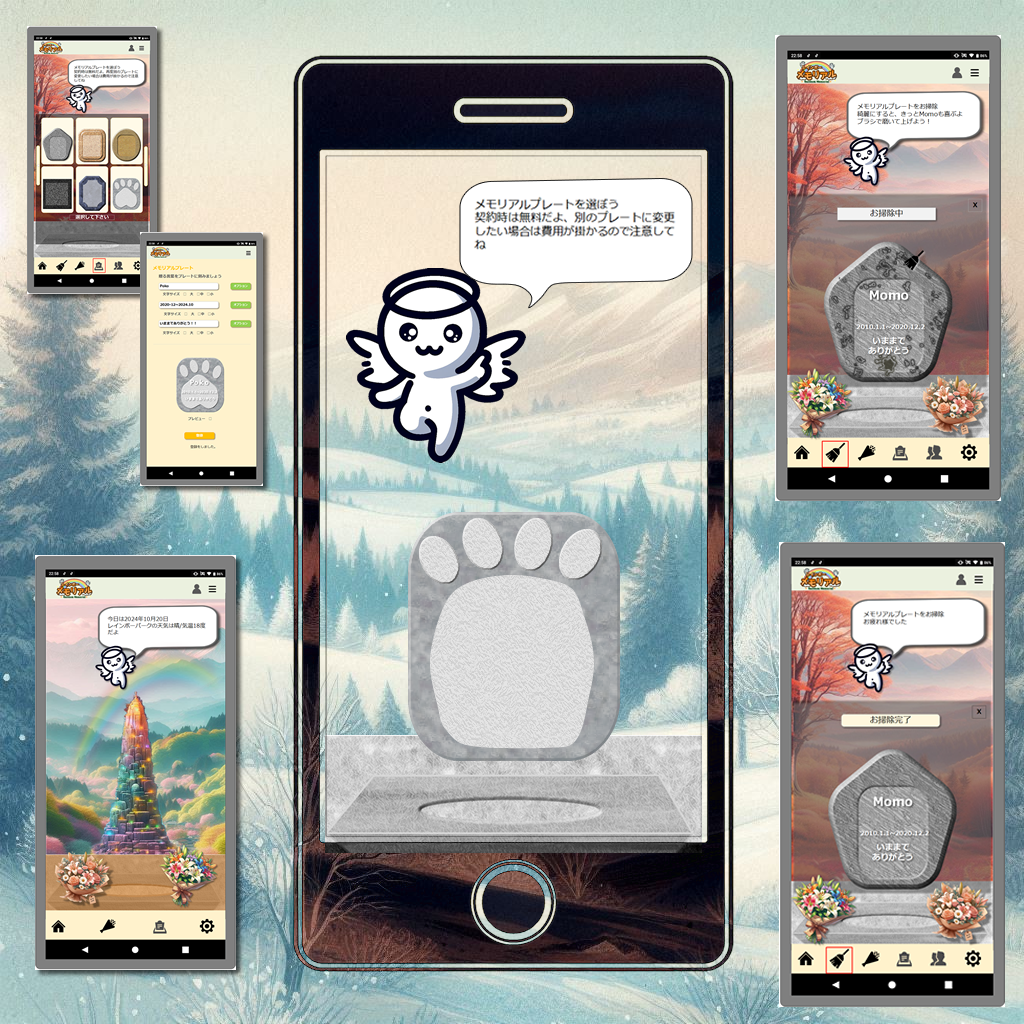 レインボーメモリアルアプリは少なからず、宗教的な葬儀の要素に沿ったものになっていますが、できる限り特定宗教の慣習や表現は使用しないように配慮しています。宗教観は人それぞれお持ちです、特定の宗教の儀式や表現にならないよう配慮し、亡くなったペットを思い出しながら、貴方の心を癒やしペットの死後の幸福を祈るというテーマで、利用出来るように構成されています。ペットの墓標(レインボープレート)のある場所に訪れて、プレートが汚れていれば磨いて綺麗に清掃し、花を添えたり、手を合わせる、現実の世界でも執り行われる祭事をアプリ中でも再現しています。それは単なる仮想空間での機械的な操作ではありません、一つ一つの所作が思い出と共に貴方の癒やし効果となり、傷ついた心を癒やす為のサプリメントとなるはずです。貴方のペットが亡くなって心を痛めている様子を、可愛がっていたペット達が一番心配していると思います。貴方が穏やかにペットの冥福を祈り、虹の国で元気に過ごしている姿を想い描いている様を、ペット達が一番望んでいるのではないでしょうか。