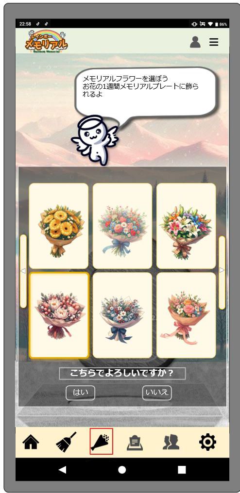 フラワー購入について 2025.07.17 メモリアルフラワー購入 ※画面は開発中のものです、実際の仕様とは異なる場合があります。 ※画面は開発中のものです、実際の仕様とは異なる場合があります。 ※画面は開発中のものです、実際の仕様とは異なる場合があります。 ※画面は開発中のものです、実際の仕様とは異なる場合があります。